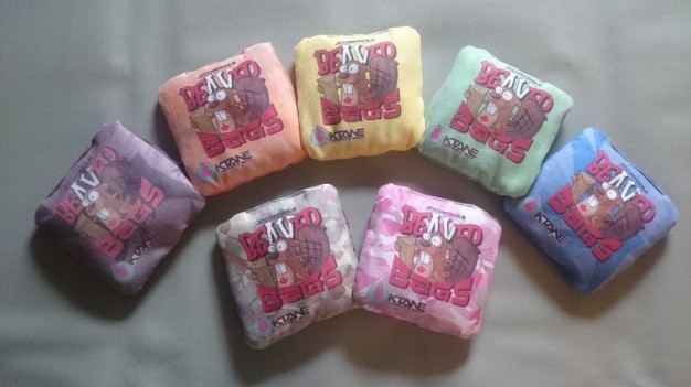 Hand sewn, using 12 oz. Duckcloth, filled with whole cleaned corn and stitched to last. You won't find a better beanbag!!